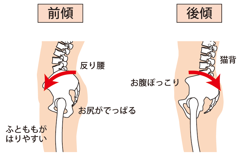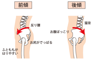 見た目では、腰が反ってお腹が前に出たり、お尻が後ろへ出っ張って見えやすいのが特徴です。